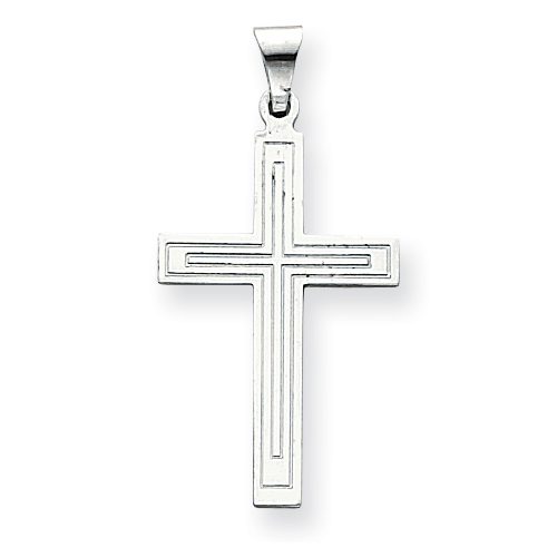 14k white gold Latin cross pendant has a lined texture. Item measures 11/16 inches wide by 1 1/8 inches tall without loop and bail. One of the oldest forms of the cross, the Latin cross is also the true form of the cross. Weight: 1.37 grams. Made in USA.