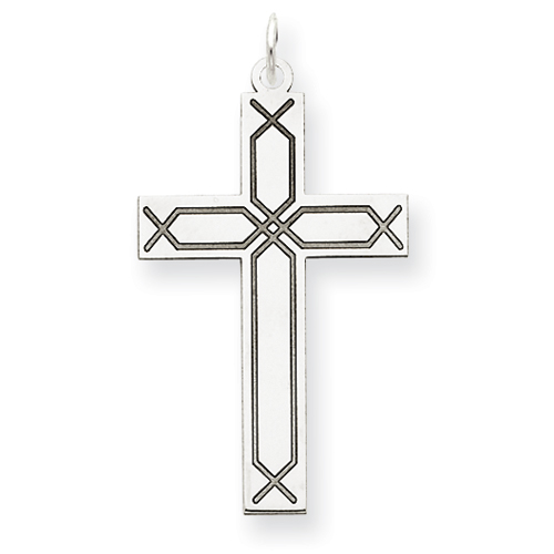 14k white gold laser designed cross pendant has a twill design. Weight: 1.87 grams. Item measures 13/16 inch wide by 1 5/16 inches tall without loop and bail. One of the oldest forms of the cross, the Latin cross is also the true form of the cross.