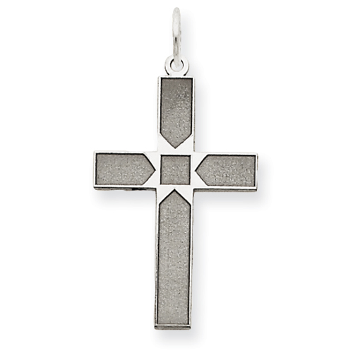 This laser cut 14K white gold cross pendant has a square in the center. Item measures 1/2 inch wide by 3/4 inch tall without loop and bail. Polished back. Weight: 0.81 grams. Made in USA.
