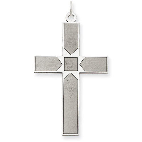 This laser cut men's 14K white gold cross pendant has a square in the center. Item measures 13/16 inch wide by 1 1/4 inches tall without loop and bail. Weight: 2 grams. Made in USA.
