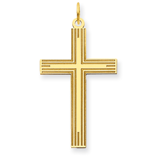 Laser designed cross pendant is made of solid 14k yellow gold. Item measures 5/8 inch wide by 1 inch tall without loop and bail. Fits up to a 2.5mm wide chain. Weight: 1.2 grams. This item is the size of a quarter.