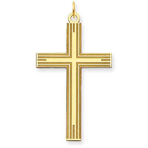 Laser etched Latin cross pendant is made of solid 14k yellow gold. Item measures 13/16 inch wide by 1 1/4 inch tall without loop and bail. Fits up to a 3mm wide chain. Approximate weight: 1.87 grams.