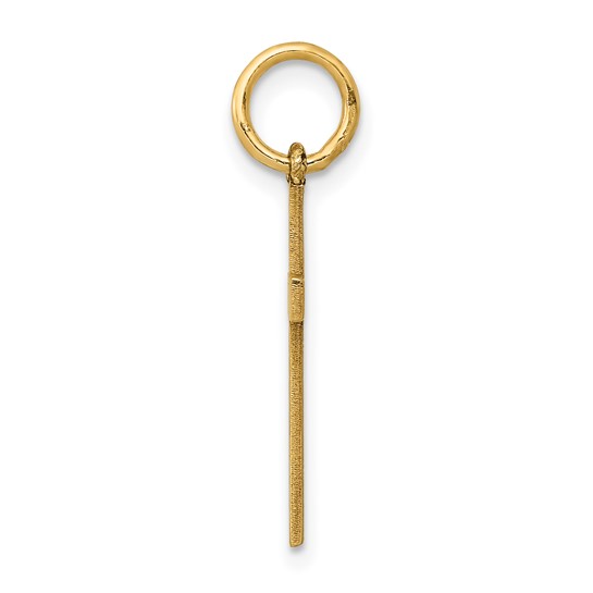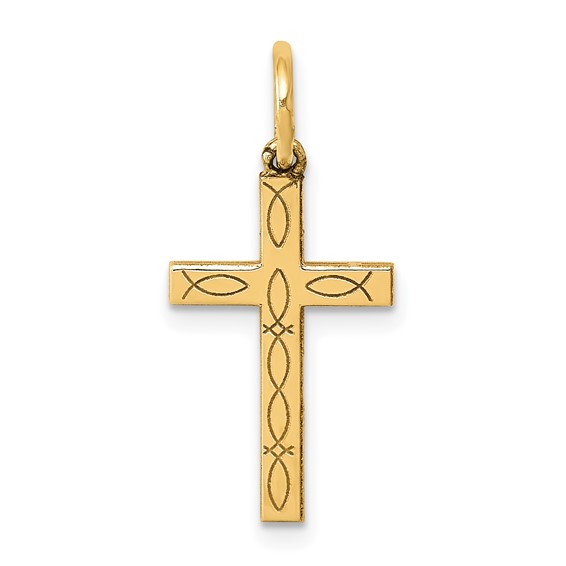 This small 14k yellow gold cross has laser engraved fish / ichthus design. Item measures 3/8 inch wide by 5/8 inch tall without loop and bail. Weight: 0.56 grams.