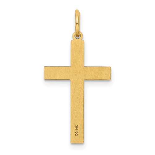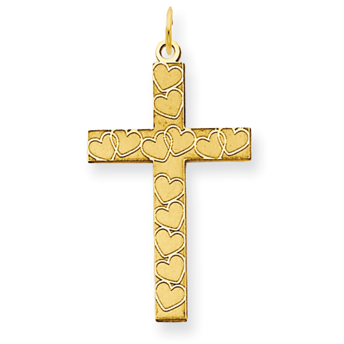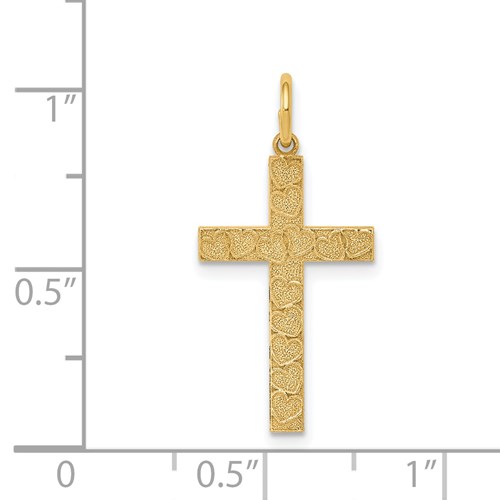 14k yellow gold Latin cross pendant features laser engraved hearts. Item measures 1/2 inch wide by 3/4 inch tall without loop and bail. This cross is the size of a penny. Weight: 0.85 grams.