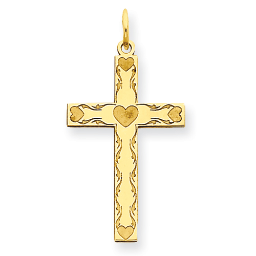 14k yellow gold cross pendant has laser etched hearts and a polished finish. Item measures 1/2 inch wide by 3/4 inch tall without loop and bail. Weight: 0.75 grams. Made in USA.