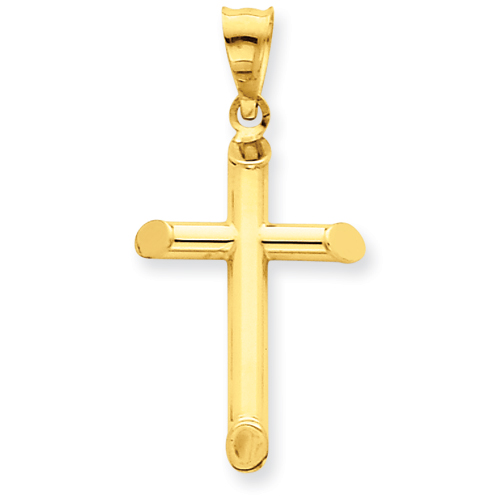This ladies' 3-D polished hollow cross pendant is made of 14k yellow gold. Weight: 0.92 grams. Item measures 5/8 inch wide by 7/8 inch tall without loop and bail. Fits up to a 3mm wide chain.