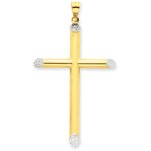 This tube cross pendant is made of polished 14k white and yellow gold. Hollow and diamond-cut. Item measures 1 1/4 inches wide by 1 7/8 inches tall without bail. Weight: 2.04 grams. Made in Mexico.