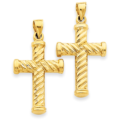 Reversible diamond cut cross pendant is made of 14k yellow gold. Item measures 11/16 inch wide by 1 11/16 inches tall without loop and bail. Hollow. Fits up to a 3mm wide chain. Weight: 1.28 grams. Import.
