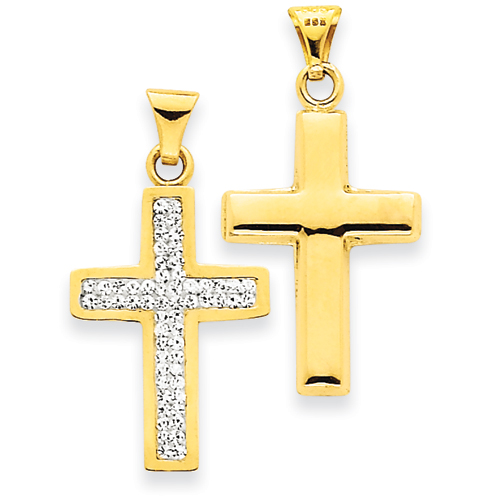 14kt yellow gold Reversible Crystal Latin Cross Pendant. Weight: 0.46 grams. Item measures 9/16 inch wide by 3/4 inch tall without loop and bail.