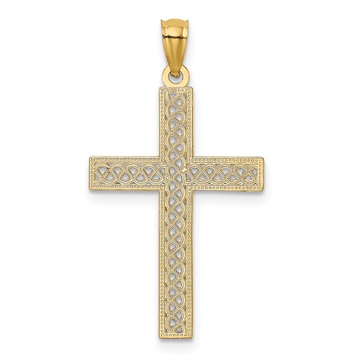 Polished diamond-cut filigree cross pendant is made of solid 14k yellow gold. Weight: 0.72 grams. Item measures 11/16 inch wide by 1 inch tall without loop and bail. Fits up to a 3mm wide chain. Made in USA.