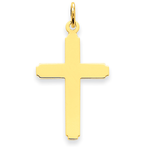 This solid 14k yellow gold Latin cross pendant has cut-out corners. Weight: 0.68 grams. Item measures 21/32 inch wide by 1 inch tall without loop and jump ring. Jump ring dimensions: 3.8mm x 3.8mm. Made in USA.