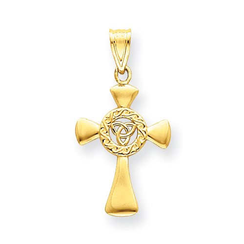 Tapered open Celtic cross pendant is made of polished 14kt yellow gold. Item measures 5/8 inch wide by 7/8 inch tall without loop and bail. Fits up to a 3.5mm wide chain. Weight: 1.01 grams. Originating in Ireland and taken to the Island of Iona by St. Columbia, the Celtic cross was created in stone with the circle to hold the bars of the cross. The circle around this cross symbolizes eternal life.