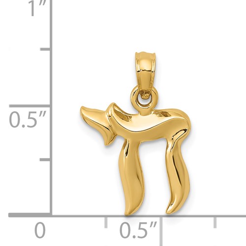 Open back Chai charm is made of solid 14kt yellow gold. Item size: 1/2 inch wide by 1/2 inch tall without loop and bail. Weight: 0.75 grams. This charm is half the size of a quarter. Popular to a Jewish tradition, chai is a symbol of well-being and best wishes. The word chai means alive, life, or living.