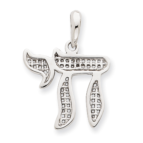 14k white gold Chai pendant has a mesh texture. Weight: 2 grams. Item measures 3/4 inch wide by 3/4 inch tall without loop and bail. Popular to a Jewish tradition, chai is a symbol of well-being and best wishes. The word chai means alive, life, or living.