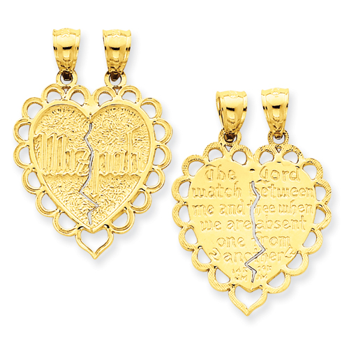 Reversible mizpah two piece break apart heart charm is made of 14k yellow gold. Item measures 13/16 inch wide by 7/8 inch tall without loop and bail. Approximate weight: 2.89 grams. Made in Peru. Ships from USA.