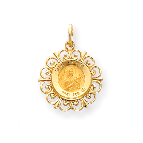 This ladies' solid 14k yellow gold Saint Theresa medal has a fancy border. Item measures 3/4in x 3/4in without loop and bail. This item is the size of a penny. Engraving: SAINT THERESA PRAY FOR US. Fits up a 3mm wide chain. Made in USA.