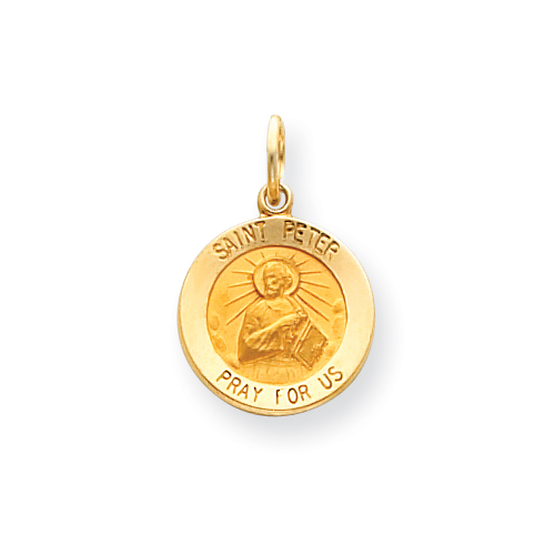This very small Saint Peter medal is made of solid 14k yellow gold. Item measures 9/16 inch without loop and bail. Approximate weight: 1.25 grams. Flat back. Made in USA.