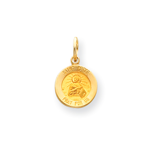 This tiny Saint Peter medal charm is made of solid 14k yellow gold. Item measures 7/16 inch round without loop and bail. This item is half the size of a nickel, and much smaller than a dime. Fits up to a 2mm wide chain. Approximate weight: 2.0 grams. Made in USA.
