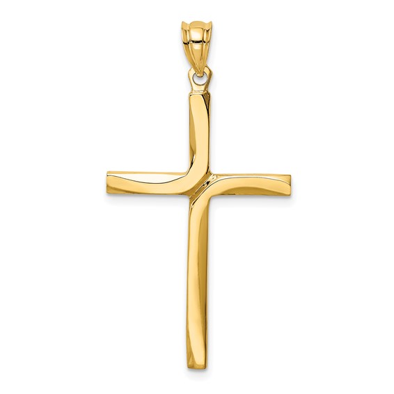 14kt yellow gold cross has a polished and satin finish. Weight: 2.28 grams. Item measures 15/16 inch wide by 1 1/2 inches tall without bail. This item is larger than a half dollar. Fits up to a 3mm wide chain.