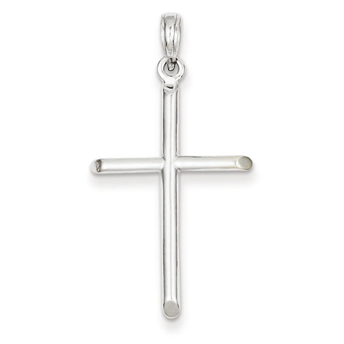 14k white gold hollow cross pendant has a polished finish. Weight: 1.86 grams. Item measures 3/4 inch wide by 1 1/16 inches tall without loop and bail. Made in USA.