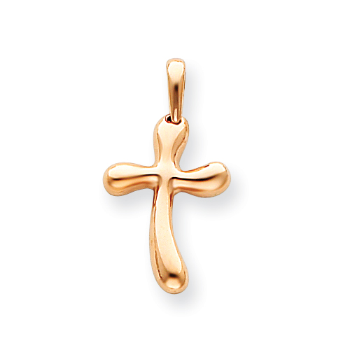 This ladies' freeform cross pendant is made of solid 14k rose gold. Weight: 1.9 grams. Item measures 9/16 inch wide by 13/16 inch tall without bail. Fits up to a 3mm wide chain. Made in USA.