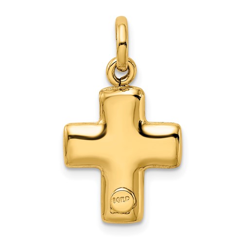 Puffed cross charm is made of polished 14kt yellow gold. Hollow Weight: 1.2 grams. Item measures 9/16 inch wide by 5/8 inch tall without loop and bail. This item is smaller than a dime.