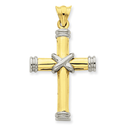 This large 14k yellow gold Latin cross pendant has white gold tips and X center. Item measures 1 inch wide by 1 1/2 inches tall without loop and bail. The bail will accommodate a chain no wider than 2.75mm. Weight: 8.51 grams. Made in USA.