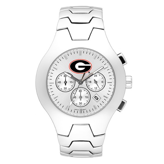 University of Georgia hall of fame watch has a 41mm stainless steel watch case with stainless steel oval-shaped chronograph pushers. Team logo is shown above the subdials. The Hall of Fame™ model features a Citizen® chronograph movement with date window and has Swiss luminous diamond cut hands. Solid stainless steel polished bracelet with butterfly clasp. The mineral glass lens has a non-reflective coating. Water-resistant to 10 ATM. Showcased in an aluminum gift box. Two year limited warranty.
