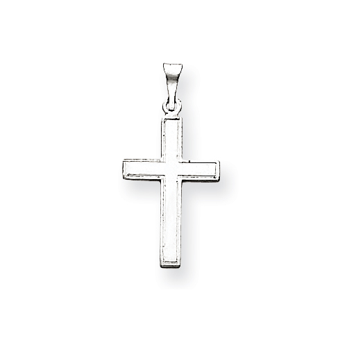This small 14k white gold Latin cross pendant has a Florentine style texture. Item measures 7/16 inch wide by 11/16 inch tall without loop and bail. Weight: 0.4 grams. Made in USA.