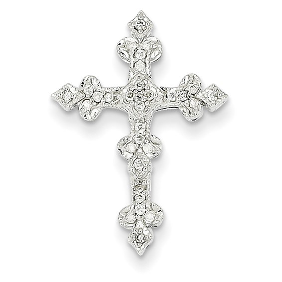 14k white gold .14 carat total weight diamond filigree cross pendant has a polished finish. Diamond quality: I2 clarity, I-J color. Weight: 1.36 grams. Item measures 5/8 inch wide by 15/16 inch tall.