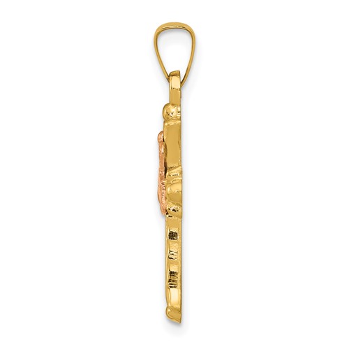 Claddagh cross pendant is made of 14k yellow gold with a 14k rose gold center. Item measures 9/16 inch wide by 3/4 inch tall without loop and bail. Fits up to a 3mm wide chain. Hollow and die struck. Flat back. Worn on the Claddagh cross, the heart is for love, the crown is for loyalty and the hands, friendship. Made in USA.