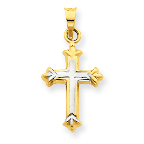 Polished 14kt yellow gold & Rhodium Hollow Cross Charm. Weight: 0.34 grams. Item measures 7/16 inch wide by 5/8 inch tall without loop and bail.
