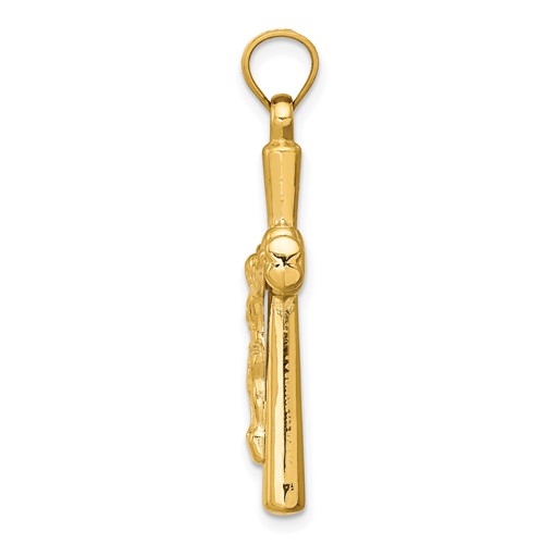 14k yellow gold reversible hollow crucifix cross pendant has a tapered shape. Item measures 5/8 inch wide by 1 inch tall without loop and bail. Fits up to a 3mm wide chain. Weight: 1.05 grams. Made in Indonesia. Ships from USA.