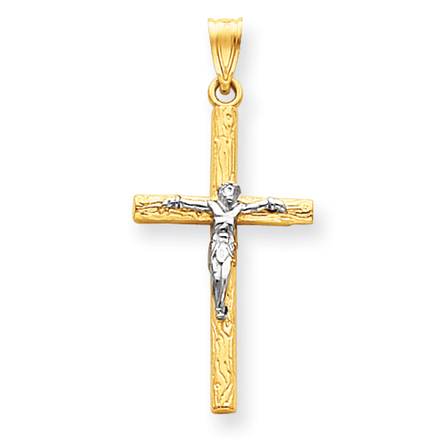 14k two-tone gold crucifix pendant has a wood grain texture. Item measures 3/4 inch wide by 1 1/4 inches tall without loop and bail. Weight: 1.9 grams. Made in USA.