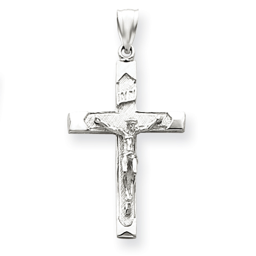 Diamond-cut Crucifix Pendant is made of polished, solid 14k white gold. Weight: 2.1 grams. Item measures 3/4 inch wide by 1 3/16 inches tall without loop and bail. Made in the USA.