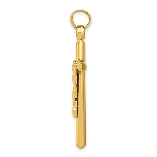 Hollow crucifix pendant is made of polished 14k yellow gold. Item measures 3/4 inch wide by 1 1/4 inches tall without bail. Fits up to a 3mm wide chain. Weight: 1.04 grams. Made in Indonesia. Ships from USA.