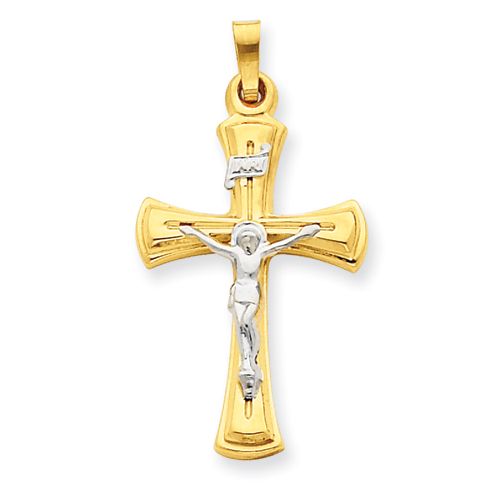 This tapered INRI crucifix pendant is made of 14kt two-tone gold. Hollow. Item measures 5/8 inch wide by 1 inch tall without loop and bail. Fits up to a 3mm wide chain. Weight: 1.25 grams. INRI means Iesus Nazarenus Rex Iudaeorem. Nailed to the top of the Cross, this Latin inscription given by Pilate translates Jesus of Nazareth, King of the Jews.