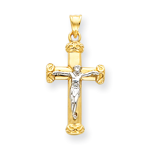14k two-tone gold crucifix pendant has an exquisite scroll design at the tips. Item measures 5/8 inch wide by 1 inch tall without loop and bail. Weight: 2.13 grams. Made in USA.
