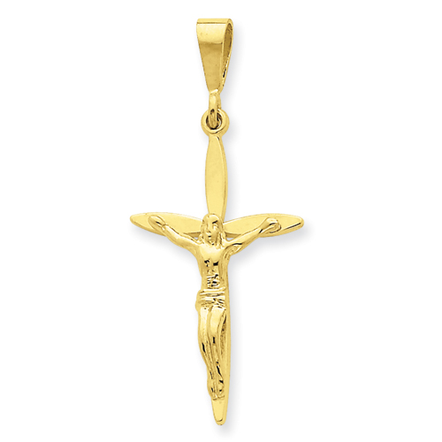 Passion crucifix pendant is made of solid 14k yellow gold. Weight: 1.94 grams. Item measures 5/8 inch wide by 1 1/8 inches tall without loop and bail. Fits up to a 3mm wide chain. Made in Peru. Ships from USA.