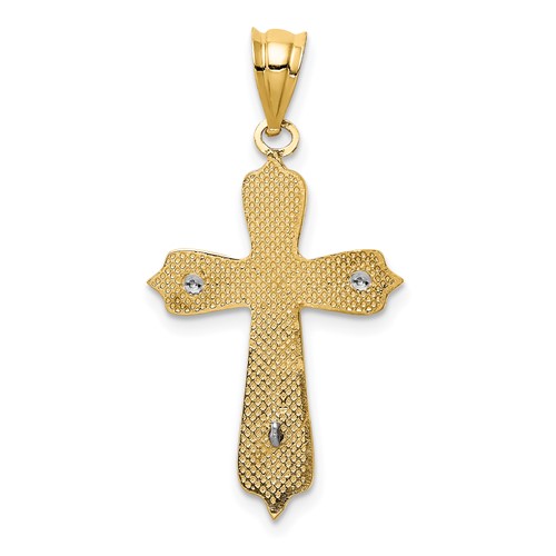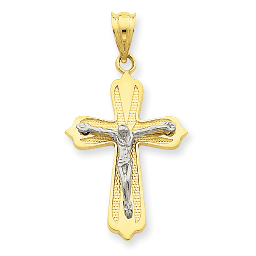 14k two-tone gold crucifix pendant has a polished and textured finish. Tapered cross. Item measures 11/16 inch wide by 15/16 inch tall without loop and bail. Weight: 1.5 grams. Made in USA.