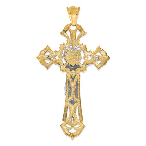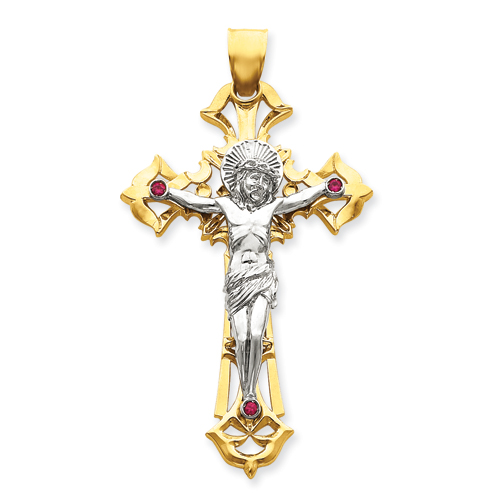 This men's very large 14k two-tone gold crucifix pendant is decorated with red cubic zirconia accents. Item measures 2 5/16 inches wide by 3 3/4 inches tall without bail. Weight: 30.95 grams. Made in USA.