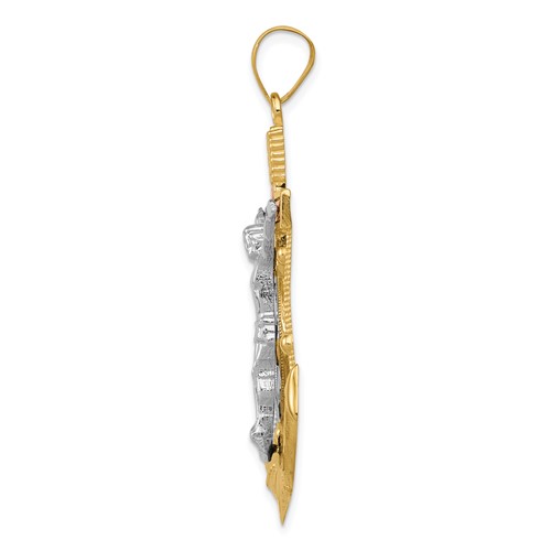 14k tri-color gold diamond-cut and textured mariner's cross pendant is large enough for a man or woman to wear. Item measures 1 3/8 inches wide by 1 7/16 inches tall without loop and bail. Shaped like an anchor, the Mariner Crucifix reminds us that Christ is our anchor, our hope. Weight: 6.3 grams. Made in USA.
