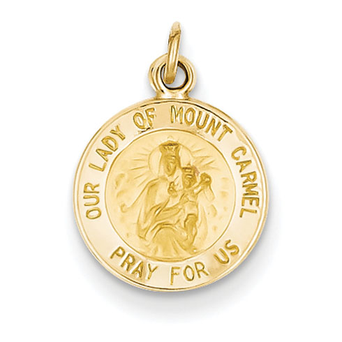 This very small round Our Lady of Mt. Carmel medal is made of solid 14k yellow gold. Item diameter: 1/2in without loop and bail. Fits up to a 2mm wide chain. Blank back. Polished finish. This charm is half the size of a quarter. Made in USA.