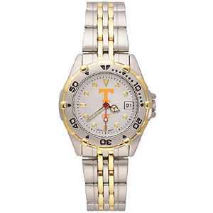 The ladies' University of Tennessee All Star watch features a stylish brushed chrome finish case. Rotating two-tone bezel and matching two tone stainless steel bracelet. The All-Star features a precision Miyota® quartz movement, distinguished dial face, with the team logo on the top half and team name on lower half of dial, date window, raised luminous hour, minute and second hands, and the crystal is mineral glass. Water resistant. Packaged in an attractive silver tin. Two year limited warranty.