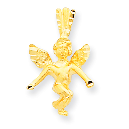 Satin and diamond-cut angel charm is made of 14kt yellow gold. Item measures 7/16 inch wide by 9/16 inch tall without loop and bail. Weight: 1.54 grams.