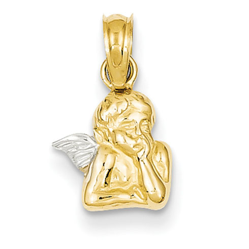 14k yellow gold and rhodium angel charm is very small. Item measures 5/16 inch wide by 3/8 inch tall without loop and bail. Weight: 0.68 grams. Made in Peru. Ships from USA.