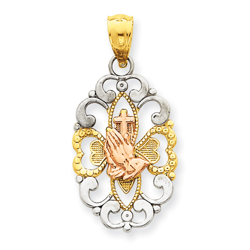 Fancy praying hands and cross pendant is made of 14k yellow gold and rhodium. Scalloped edges. Item measures 9/16 inch wide by 7/8 inch tall without loop and bail. Weight: 2.14 grams. Made in USA.