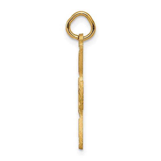 This solid 14k yellow gold dove charm is diamond-cut and has a satin finish. Item measures 9/16 inch wide by 3/4 inch tall without loop and bail. Fits up to a 2mm wide chain. Weight: 0.72 grams. Made in USA. The dove symbolizes the Holy Spirit and recalls Pentecost when the Holy Spirit was sent in Christ's place.