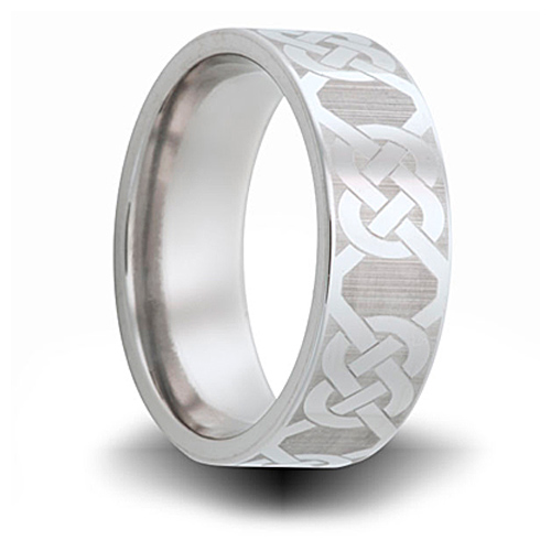 This titanium ring has a laser engraved knot pattern. Polished finish and flat center. Width: 8mm. Made of aircraft grade titanium in the USA. Deluxe comfort fit. Enjoy manufacturer's lifetime warranty for re-sizing and re-furbishing. Aircraft grade titanium [Ti 6Al-8V] is comprised of 90% titanium, 6% aluminum, 8% vanadium. It is hypoallergenic and guaranteed not to cause allergic reactions, skin irritations or discoloration of any sort. While pure grades of titanium [99.9%] used in most other titanium jewelry is very durable, Ti 6Al-8V is 2x stronger and 2.5x to 5x harder. This alloy has a tensile strength of up to 150,000 psi and a Brinell hardness value of 330.