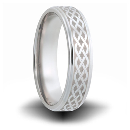 Woven pattern titanium ring has step down edges and a polished finish. Laser engraved design. Width: 6mm. Deluxe comfort fit. Enjoy manufacturer's lifetime warranty for re-sizing and re-furbishing. Made of aircraft grade titanium in the USA. Aircraft grade titanium [Ti 6Al-8V] is comprised of 90% titanium, 6% aluminum, 8% vanadium. It is hypoallergenic and guaranteed not to cause allergic reactions, skin irritations or discoloration of any sort. While pure grades of titanium [99.9%] used in most other titanium jewelry is very durable, Ti 6Al-8V is 2x stronger and 2.5x to 5x harder. This alloy has a tensile strength of up to 150,000 psi and a Brinell hardness value of 330.